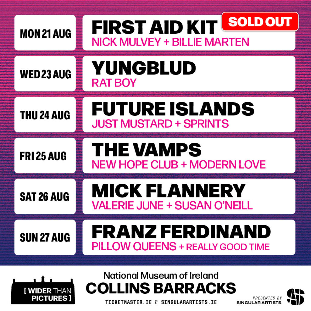 They have a host of great artists playing including First Aid Kit (Sold Out), Yungblood (23rd), Future Islands (24th), Vamps (25th), Mick Flannery (26th) & Franz Ferdinand (27th).
